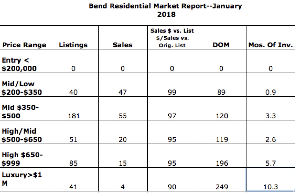 The market perked along in January . . . a bit of the “same old same old.” The locals talked about the weather . . . half the population (ourselves included!) bemoaning the the lack of snow and firm conditions at Mt. Bachelor;